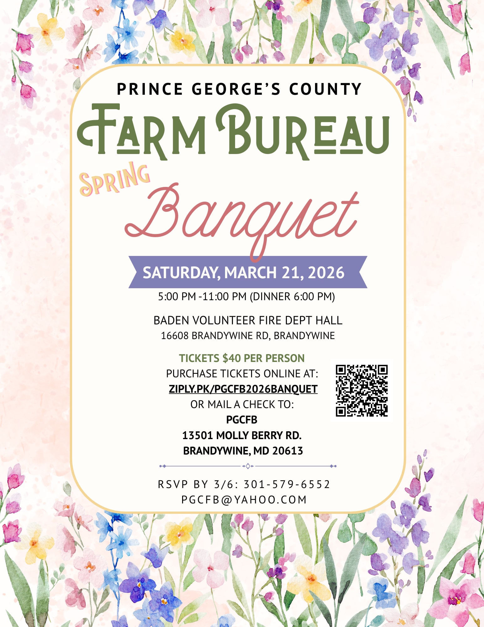 You are invited to the Prince George's County Farm Bureau Spring Banquet! The banquet will take place at Baden Volunteer Fire Department Hall on Saturday, March 21st. The doors will open at 5:00pm and dinner will be served at 6:00pm. Tickets are $40 per person. You can purchase the tickets online by clicking "register" or mail a check to 13501 Molly Berry Rd. Brandywine, MD 20613. Please RSVP by March 3rd.